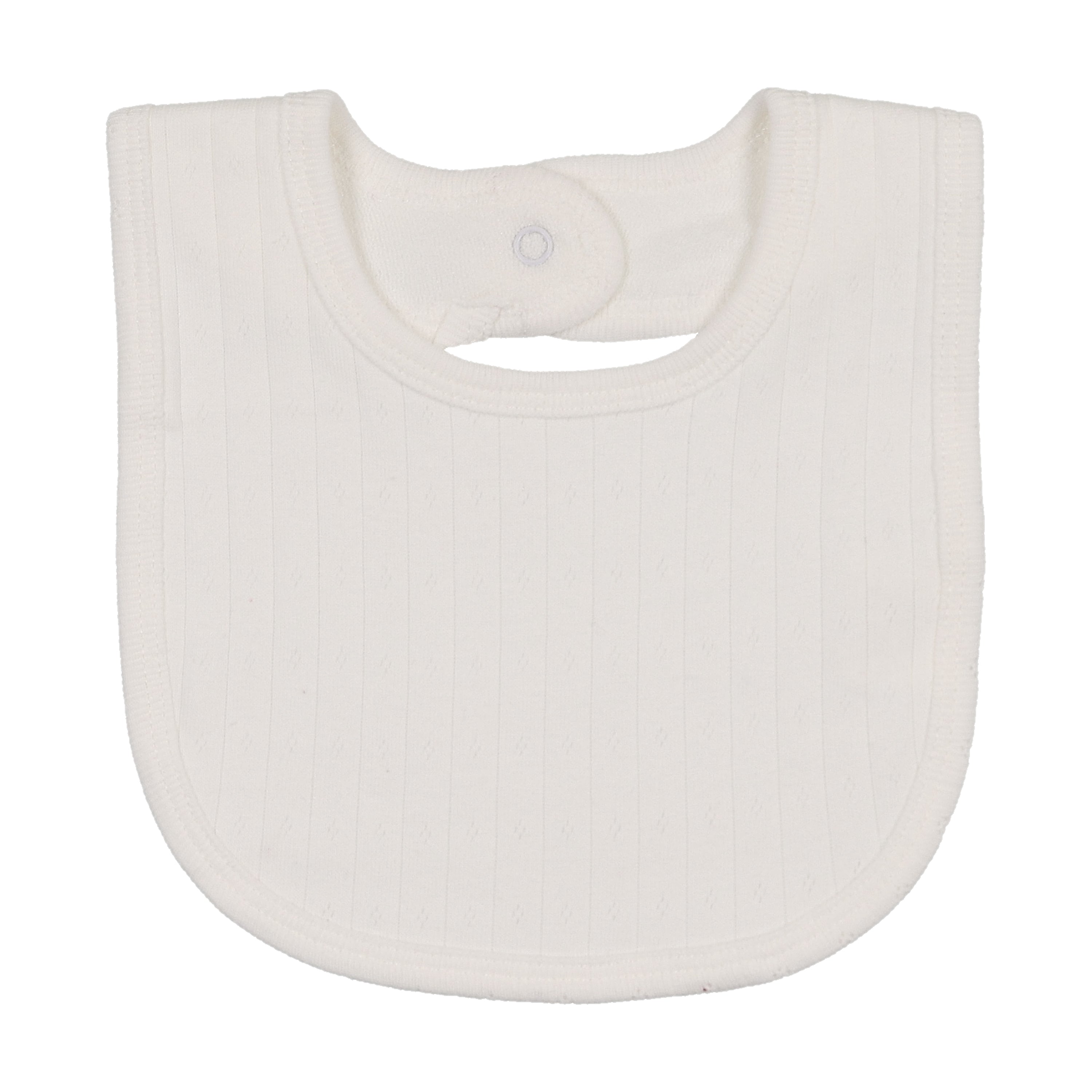 Elevate your little one's mealtime with this refined ivory bib, crafted from delicate pointelle fabric that combines breathable comfort with understated elegance. The classic Peter Pan collar design adds a timeless touch, while the soft, textured weave ensures gentle care for sensitive skin. Perfect for feeding moments or special occasions, this bib seamlessly transitions from practical to polished.