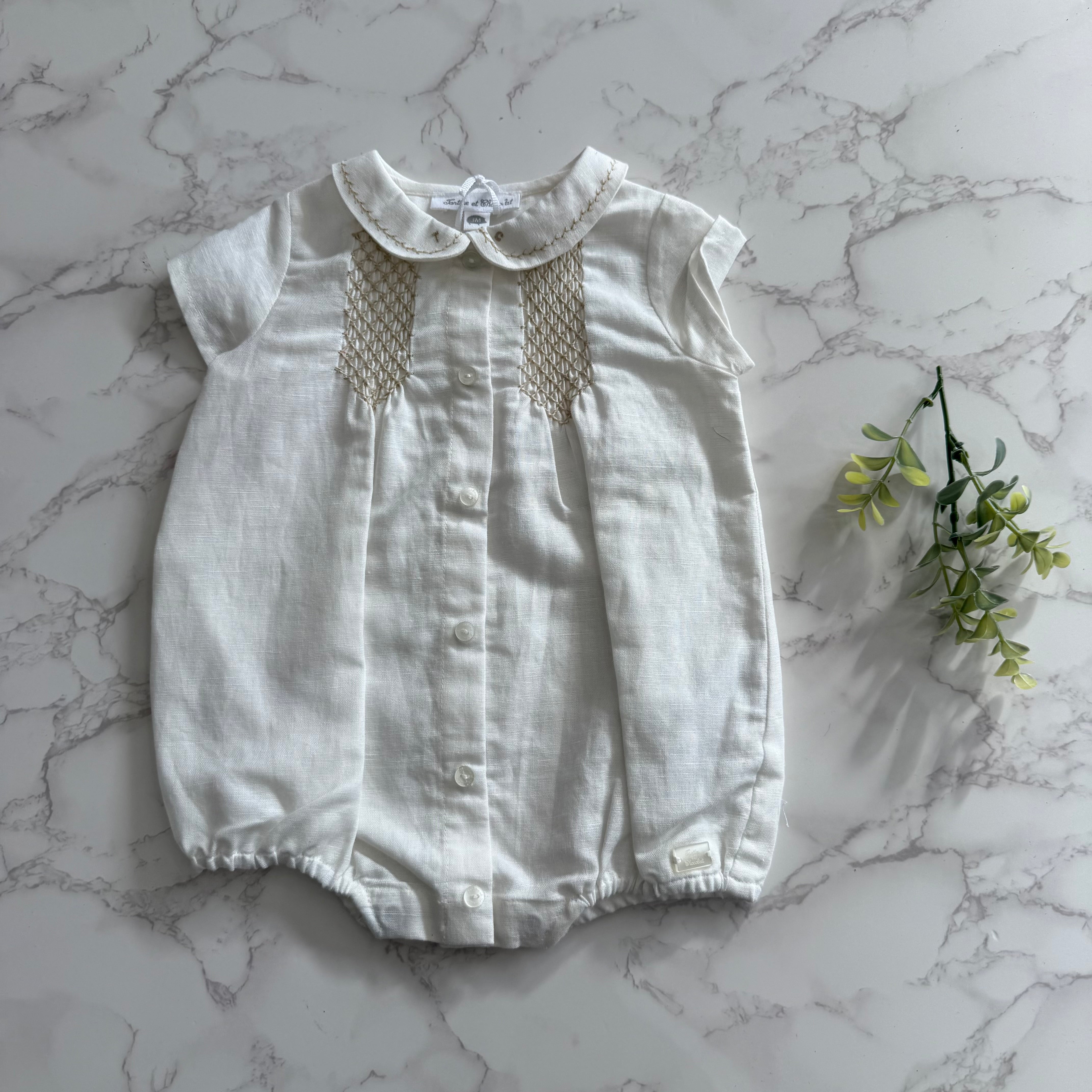 Introducing the Tartine et Chocolate Nacre Peter Pan Collar Romper—a whimsical one-piece that captures timeless charm with modern flair. This delightful bubble romper features an iconic Peter Pan collar that adds a touch of storybook elegance, while the soft, lustrous nacre fabric catches the light beautifully. Perfect for special occasions or everyday adventures, this playful piece combines comfort with classic style. Your little one will feel like they've stepped straight out of a fairy tale!