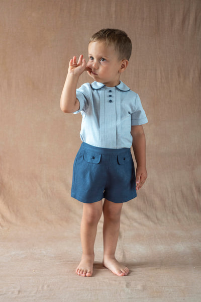 These navy linen shorts embody understated refinement with their clean lines and thoughtful flap pocket design. The lightweight fabric drapes beautifully while maintaining its shape, making them ideal for warm climates and layered styling. The deep navy hue pairs effortlessly with neutral tones and bold prints alike, offering versatility across seasons. A polished essential that balances comfort with contemporary elegance.