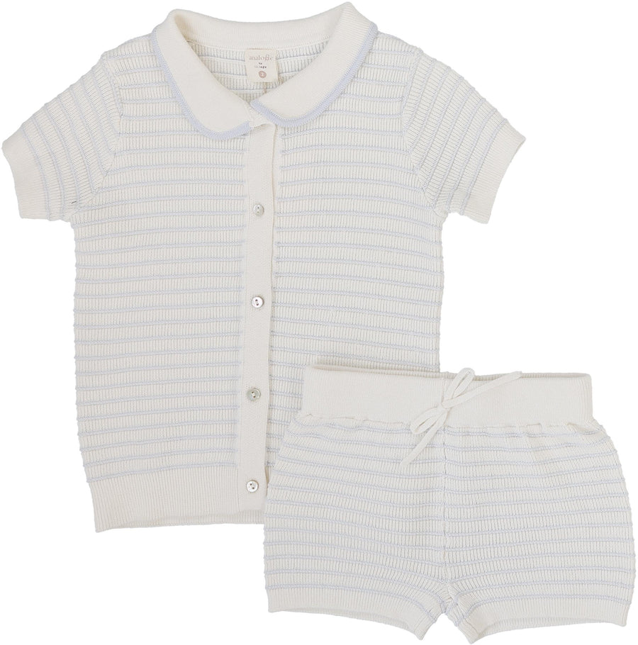 Elevate your little one's wardrobe with this refined knit set featuring soft light blue stripes and thoughtfully textured fabrication. The coordinated sweater and shorts ensemble offers effortless sophistication for everyday wear, while the quality knit construction ensures comfort and durability through active play. Perfect for creating polished, put-together looks with minimal effort.