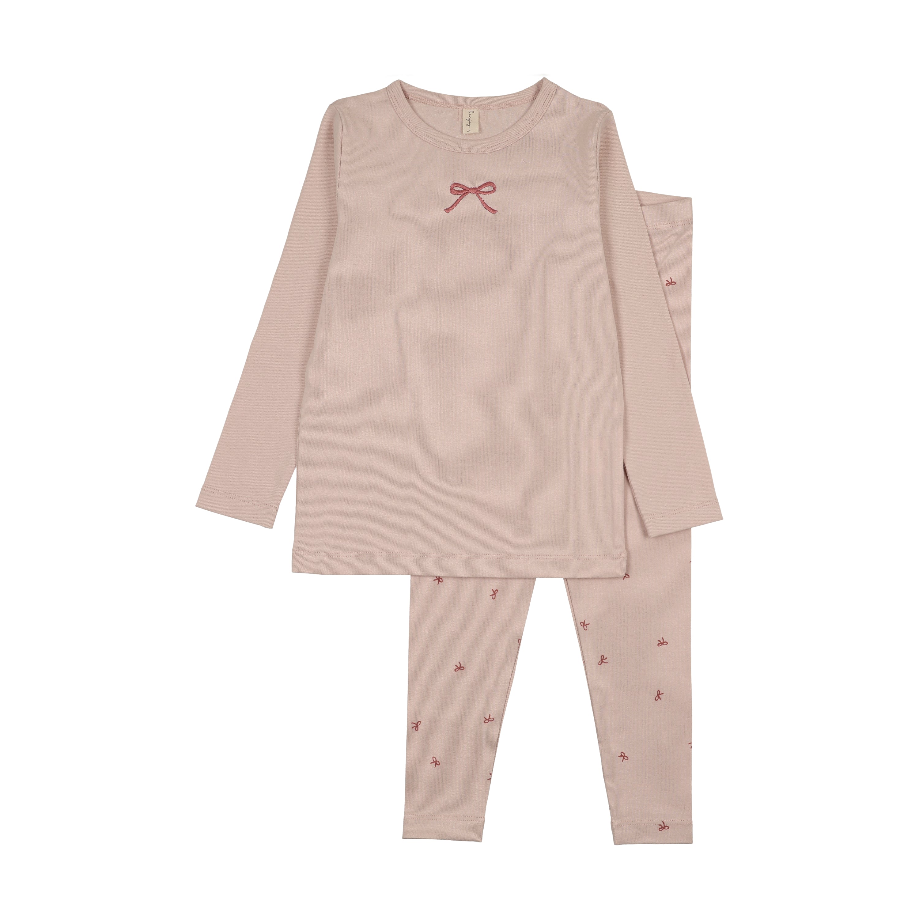 Slip into sweetness with these charming long-sleeve pajamas adorned with delicate bow graphics throughout. The soft pink hue creates a dreamy, cozy aesthetic perfect for bedtime bliss. Designed for comfort and style, these pjs feature a playful bow motif that adds a touch of whimsy to your sleepwear collection. Ideal for anyone who loves feminine details and all-over patterns that make getting ready for bed feel extra special.