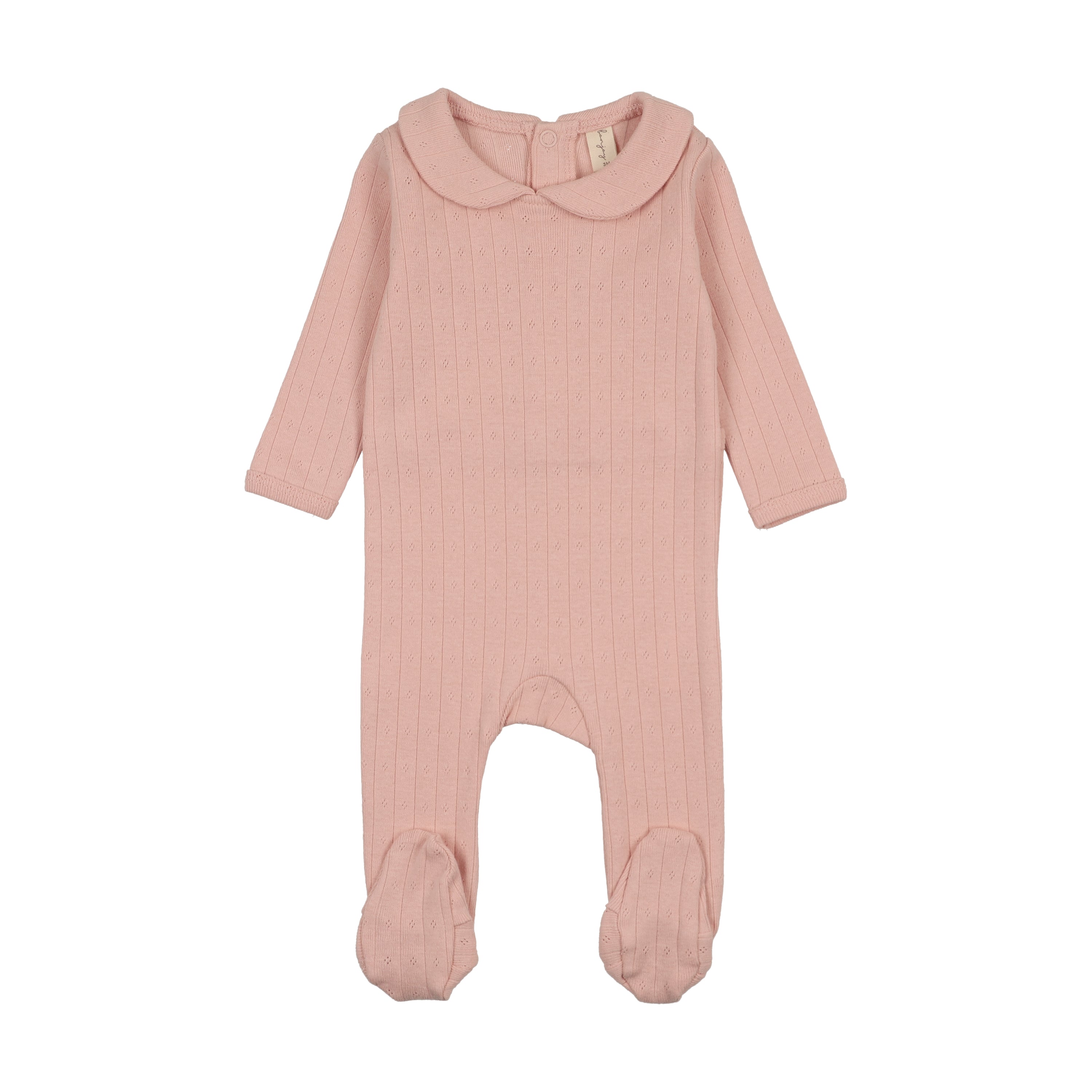 Delicate pointelle detailing adorns this charming footie, crafted in a soft salmon hue that complements any nursery aesthetic. The classic Peter Pan collar adds timeless elegance, while the footed design ensures secure comfort for your little one. Perfect for layering or wearing solo, this piece combines refined style with the gentle softness babies deserve.