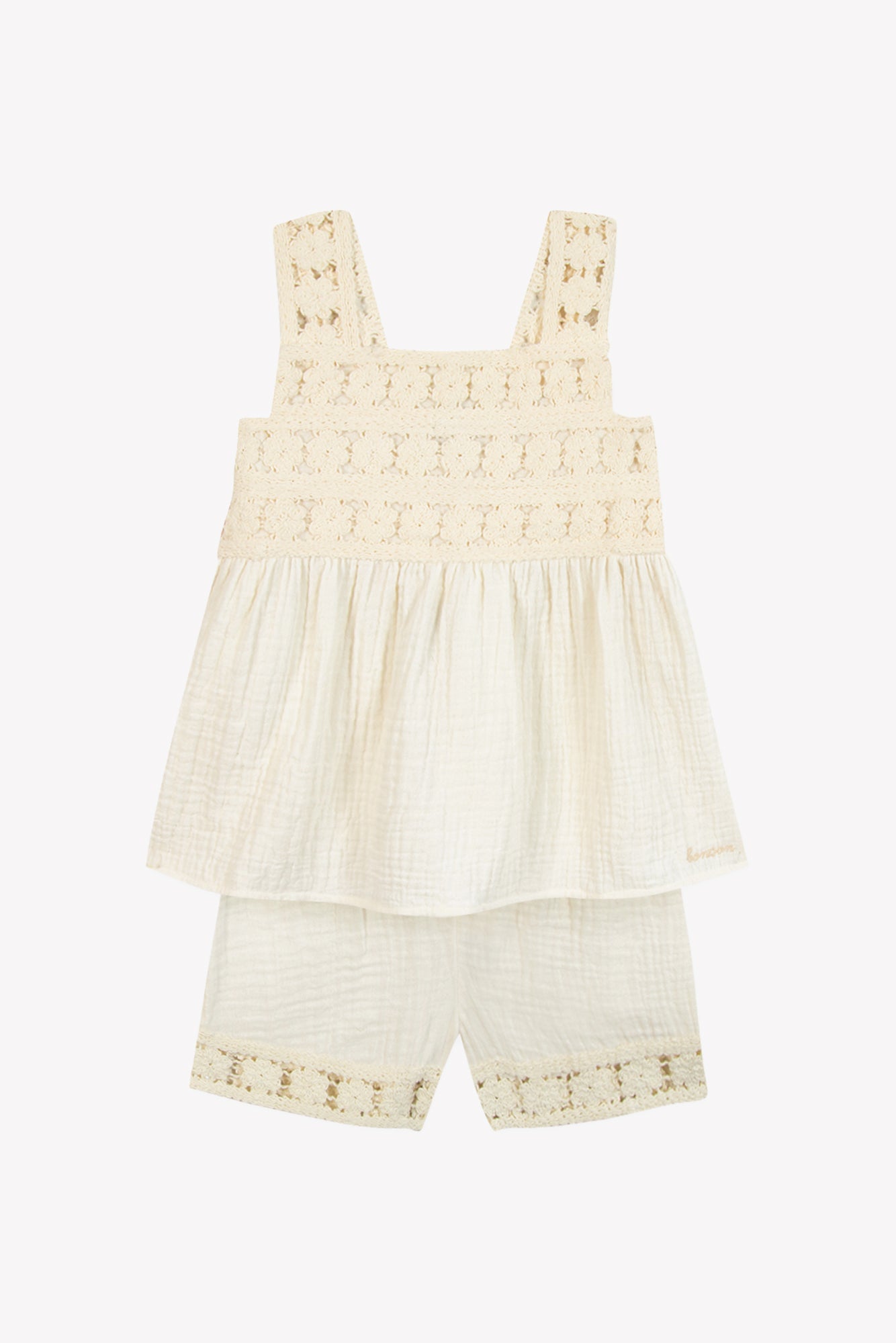 Introducing the Bonton Ecru Ensemble Nouki—a charming two-piece set that's pure joy to wear! This playful pairing features a soft ivory top paired with matching shorts, both adorned with delicate embroidered details that add a touch of whimsy. Perfect for little ones who love style with personality, this set combines comfort with character. Whether heading to playdates or family gatherings, it's the kind of outfit that makes getting dressed fun. Effortlessly chic and wonderfully wearable!