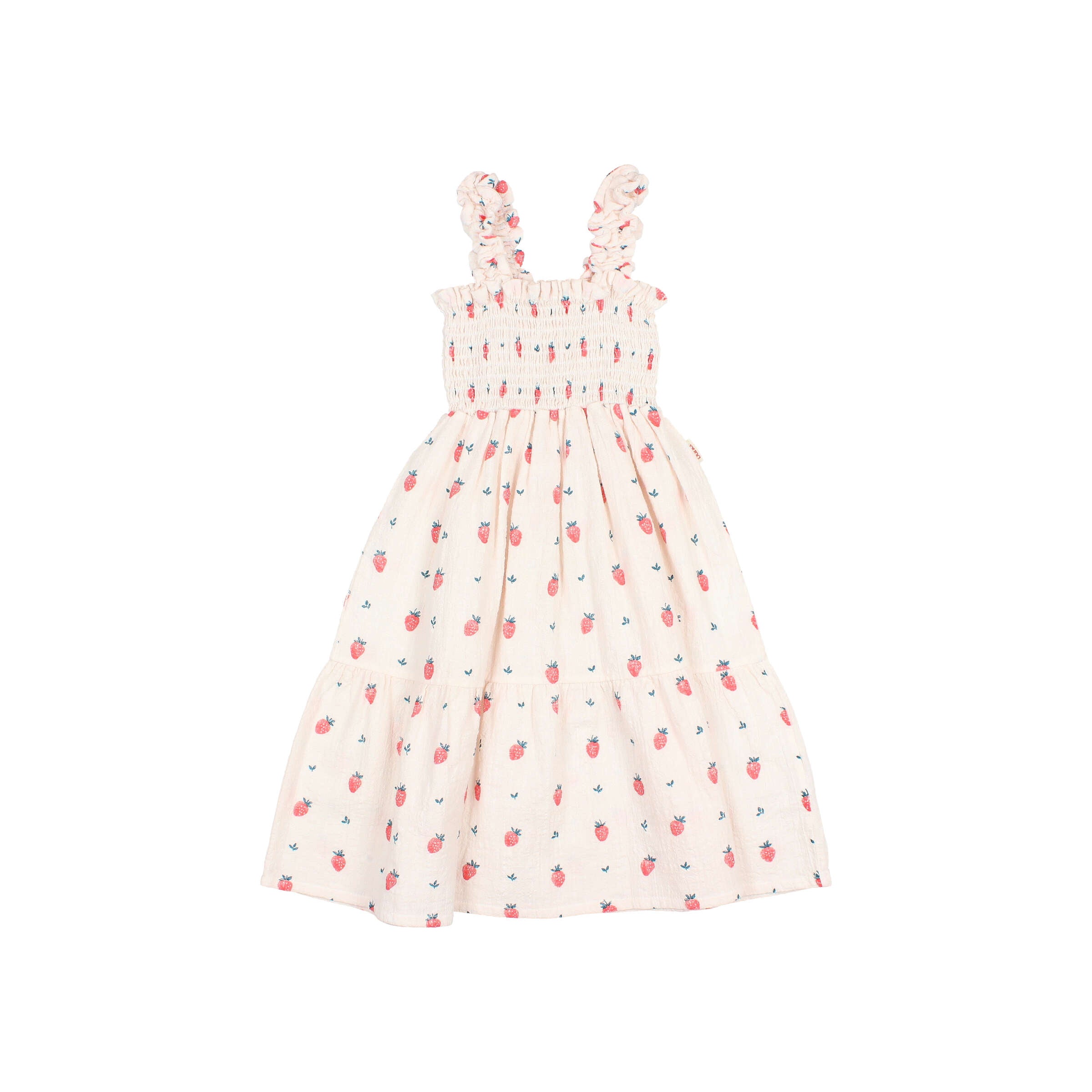 This adorable Buho dress features a soft cream pink base adorned with cheerful strawberries scattered throughout. The smocked detailing adds a charming, gathered texture that's both comfortable and oh-so-cute. Perfect for little ones who love fruity fun and timeless style!