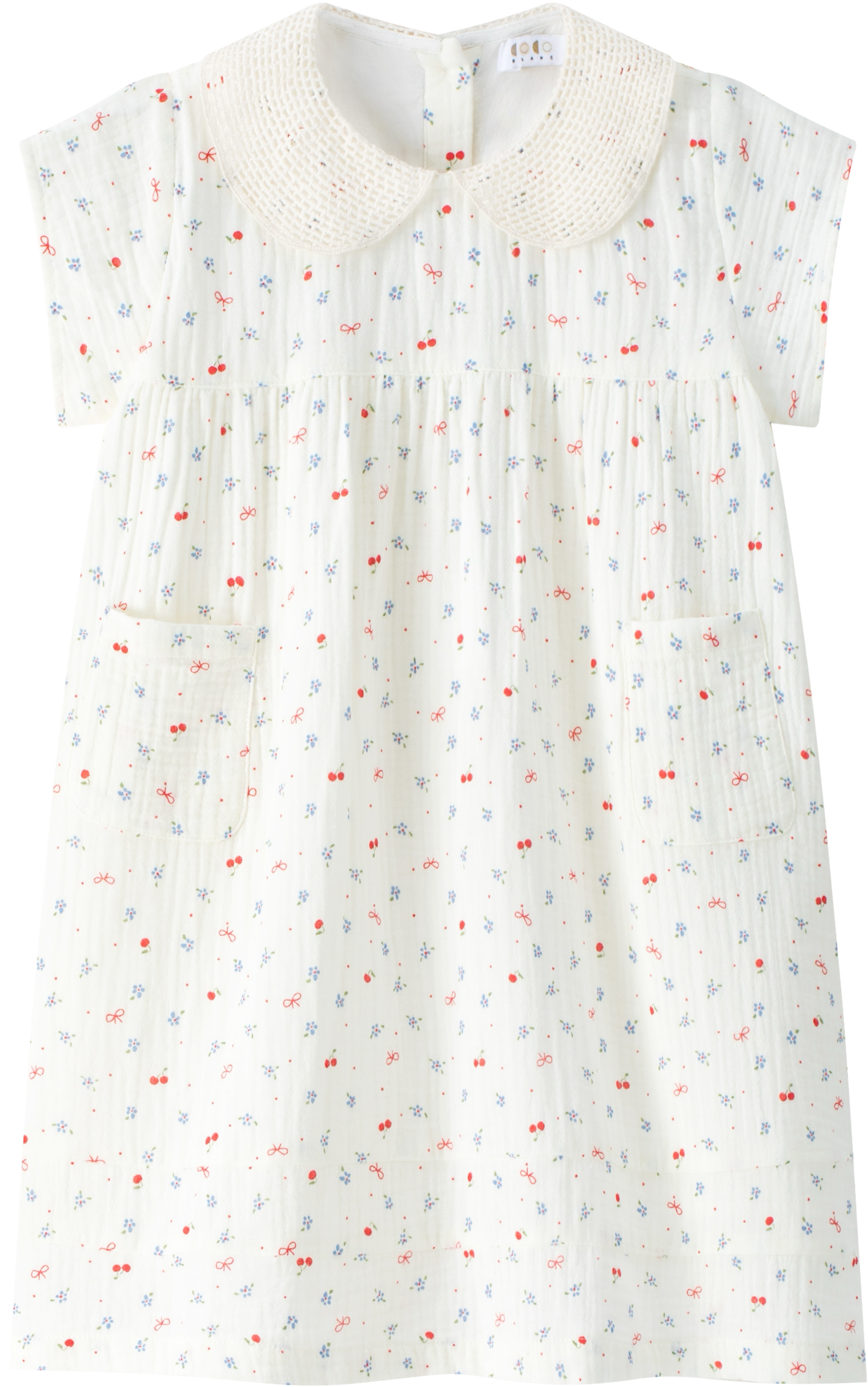 Introducing the Coco Blanc Cherry Gauze Short Sleeve Dress—a refined piece that captures timeless elegance. Crafted from delicate gauze, this dress features an enchanting all-over cherry blossom and bow motif that adds whimsical charm without sacrificing sophistication. The classic collar and short sleeves provide a polished silhouette perfect for warm-weather occasions. Whether styled for a garden party or casual gathering, this dress effortlessly blends playful details with understated grace.