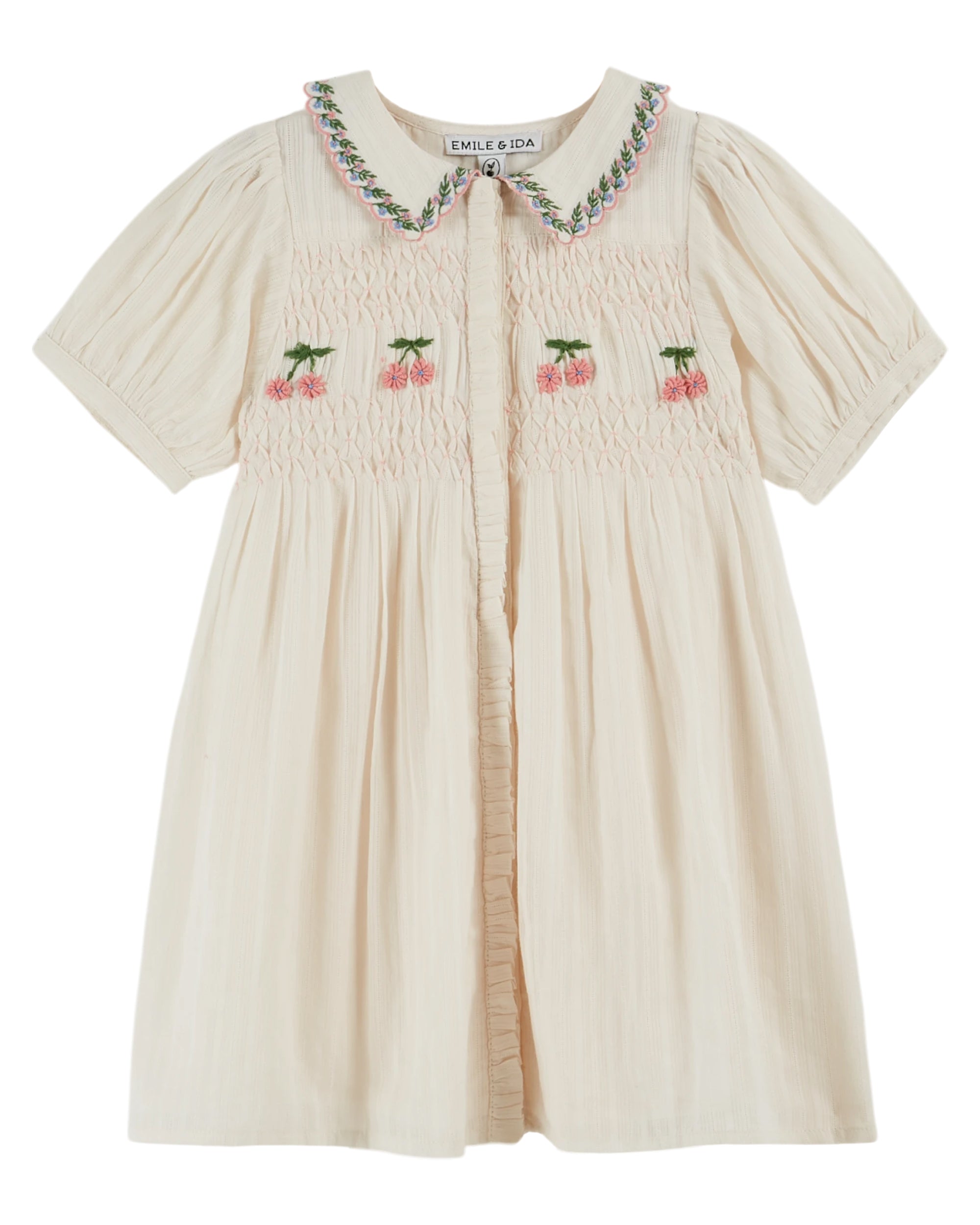 Elevate your child's wardrobe with this refined cream smocked dress from Emile et Ida. Delicate embroidered cherries dance across the bodice, while an intricately embroidered collar adds timeless sophistication. The expertly smocked construction ensures a graceful fit that grows with your little one. Perfect for special occasions or elevated everyday wear, this piece combines heirloom-quality craftsmanship with charming, whimsical details.