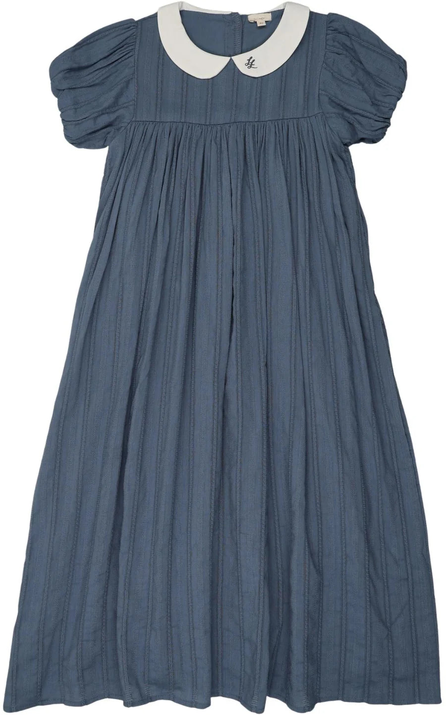 This refined blue maxi dress from Analogie showcases short sleeves and an elegant embroidered collar featuring the distinctive Lil Legs monogram. The graceful floor-length silhouette pairs beautifully with the delicate collar detailing, creating a polished look suitable for formal events or upscale occasions. The short-sleeve design offers practical comfort without compromising on sophistication, while the rich blue hue provides versatile styling options. A timeless piece that embodies understated luxury and enduring style.
