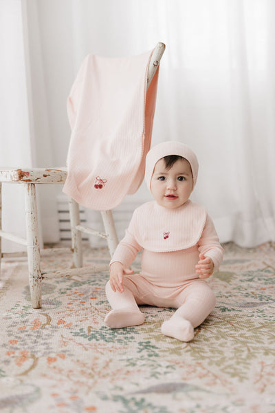 The Aurora Pink/Red Pointelle Bow Print Footie with Beanie features a soft pink base complemented by a central cherry design. The pointelle fabric is breathable, enhancing comfort for infants. The coordinating beanie provides additional warmth, making it suitable for varying temperatures. This ensemble combines style and functionality for everyday use.