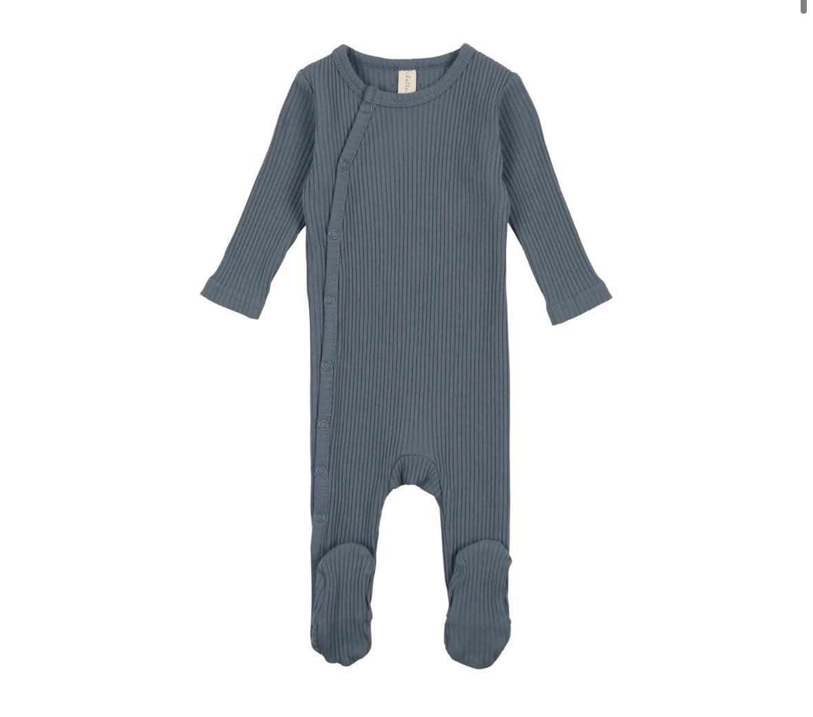 This elegant dark blue footie features a refined ribbed texture and convenient side snaps for easy dressing and changing. Crafted for both comfort and style, its classic design ensures your little one stays cozy while looking effortlessly polished. Ideal for everyday wear with a touch of sophistication.
