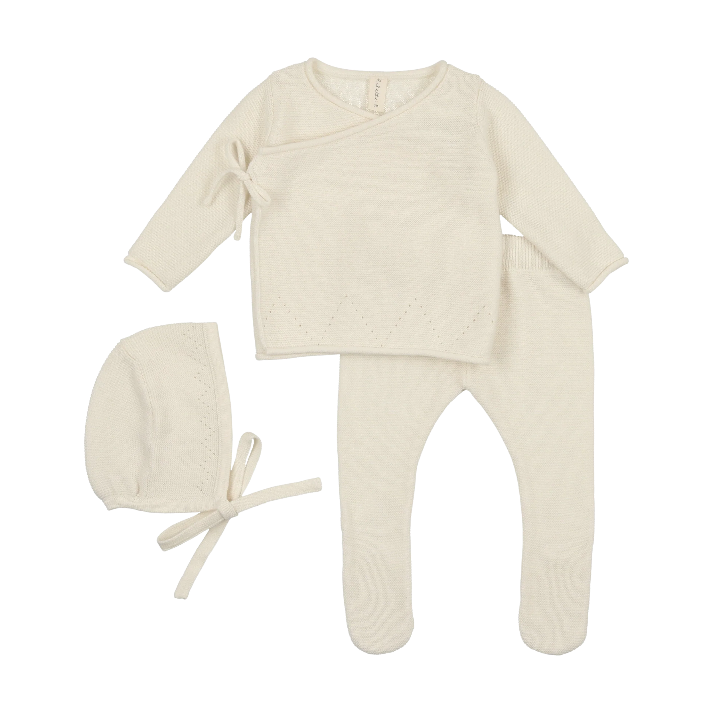 Lilette Winter White Classic Bris Set features a coordinated ensemble perfect for milestone celebrations. This sophisticated collection includes a pristine knit top, matching footed pants, and a charming bonnet—all crafted in elegant winter white. The coordinated pieces create a polished, timeless look ideal for special occasions or cherished photographs. Soft, quality construction ensures comfort for your little one throughout the day.