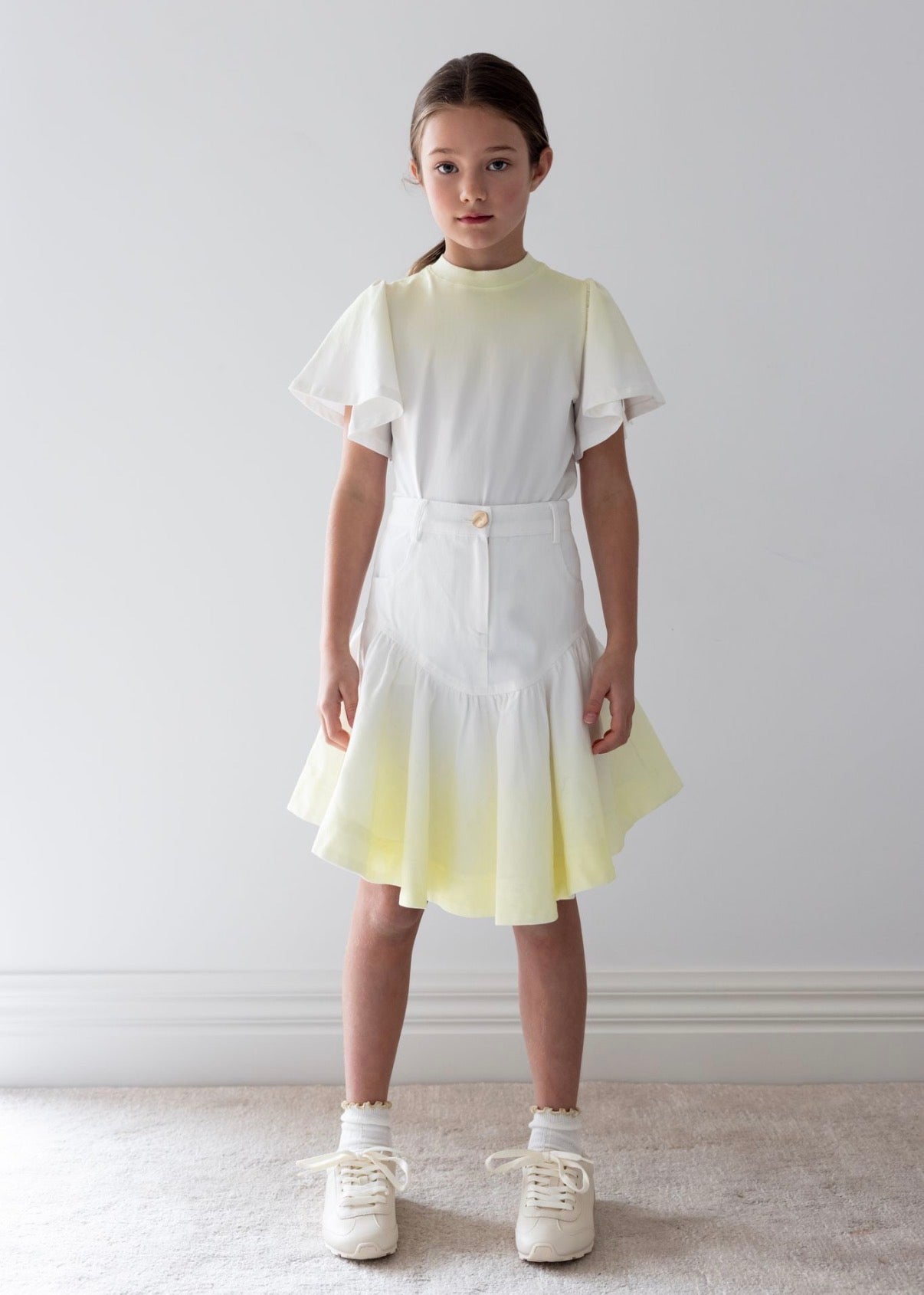 Twirl into sunshine with the Steph Yellow Tie Dye Flutter Tee! This cheerful tie dye design brings instant joy to your wardrobe, while the fluttery sleeves add a playful, feminine touch. Crafted from a soft cotton-elastane blend, it's stretchy enough to move with you and breathable enough for all-day wear. Perfect for casual outings, weekend adventures, or whenever you need a mood boost. Grab yours and let your style shine bright!