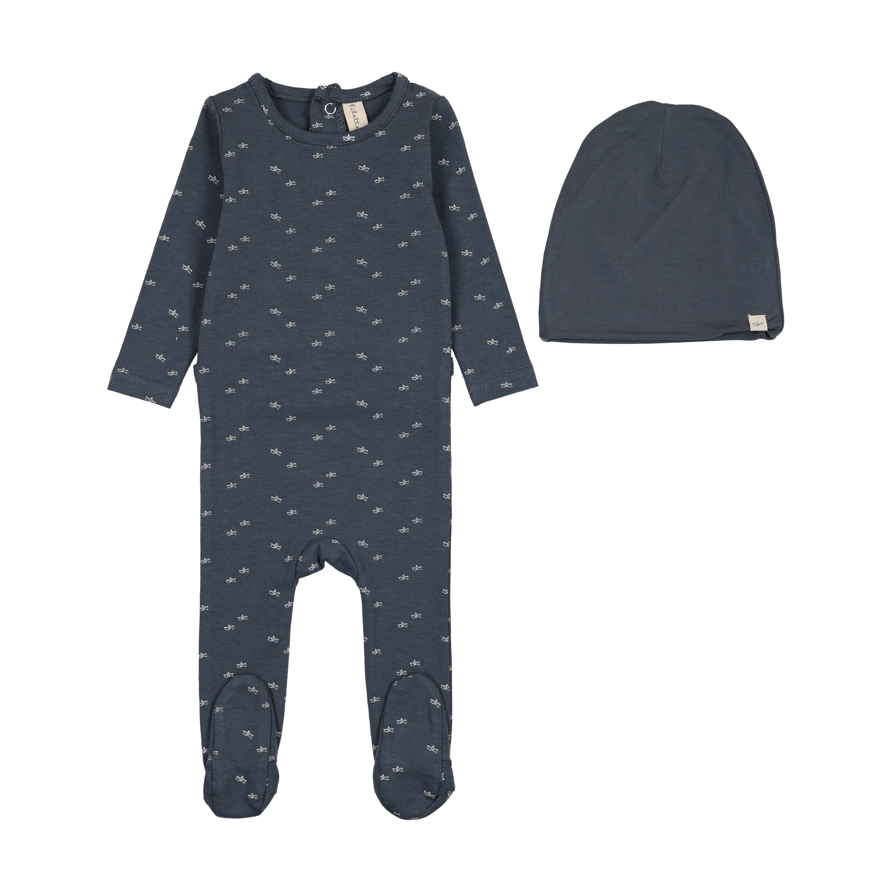 Ahoy, little explorer! This charming navy footie set whisks babies away on imaginary voyages with its whimsical paper boat print scattered across soft fabric. Complete with a coordinating solid navy hat, it's the perfect cozy companion for naps, playtime, or any adventure. Snug, sweet, and nautically delightful—your tiny sailor will love drifting off in style.