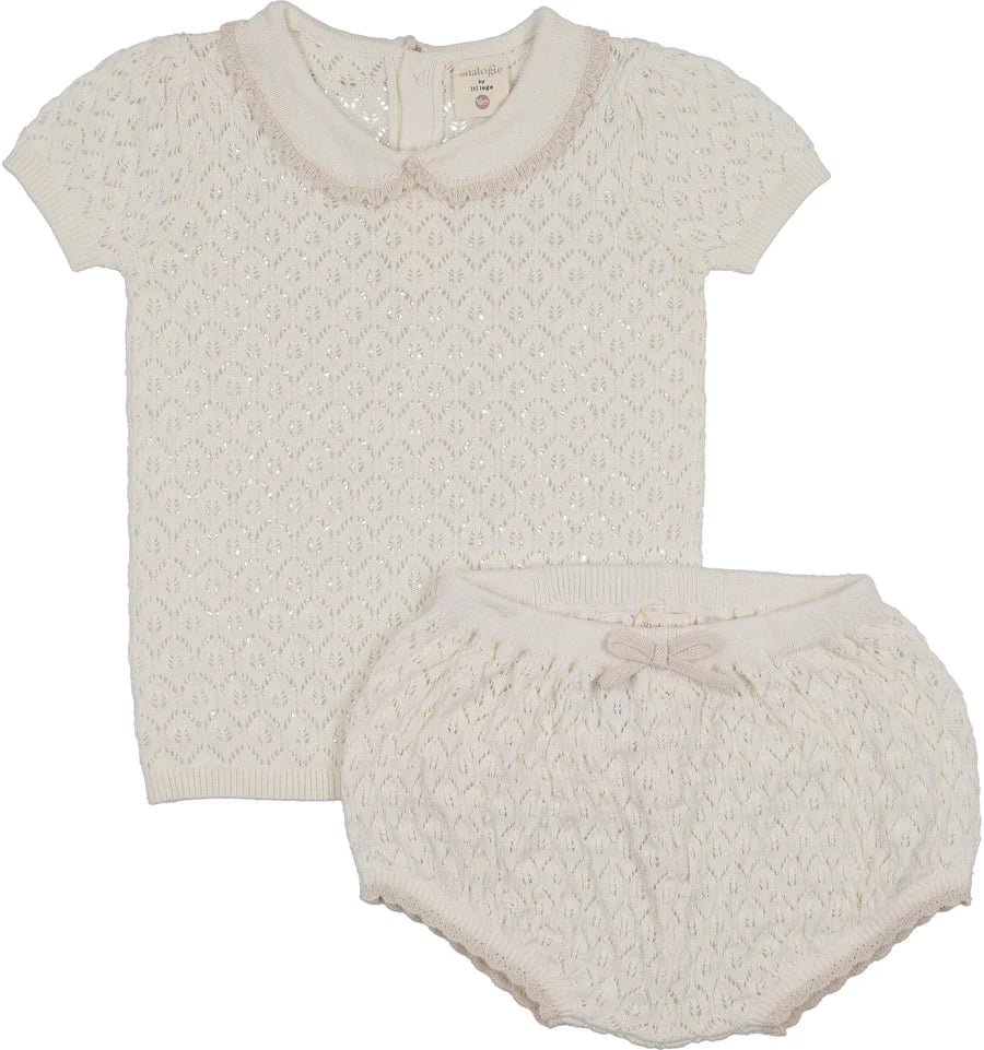 Elevate your little one's wardrobe with this refined cream pointelle knit set from Lil Legs Analogie. The delicate two-piece ensemble features a gracefully collared knit top paired with coordinating bloomers, crafted from soft, breathable pointelle fabric. The textured knit construction offers gentle stretch and comfort for active play, while the classic cream tone ensures effortless coordination with existing pieces. Perfect for special occasions or everyday elegance, this thoughtfully designed set combines timeless style with practical comfort for the modern child.