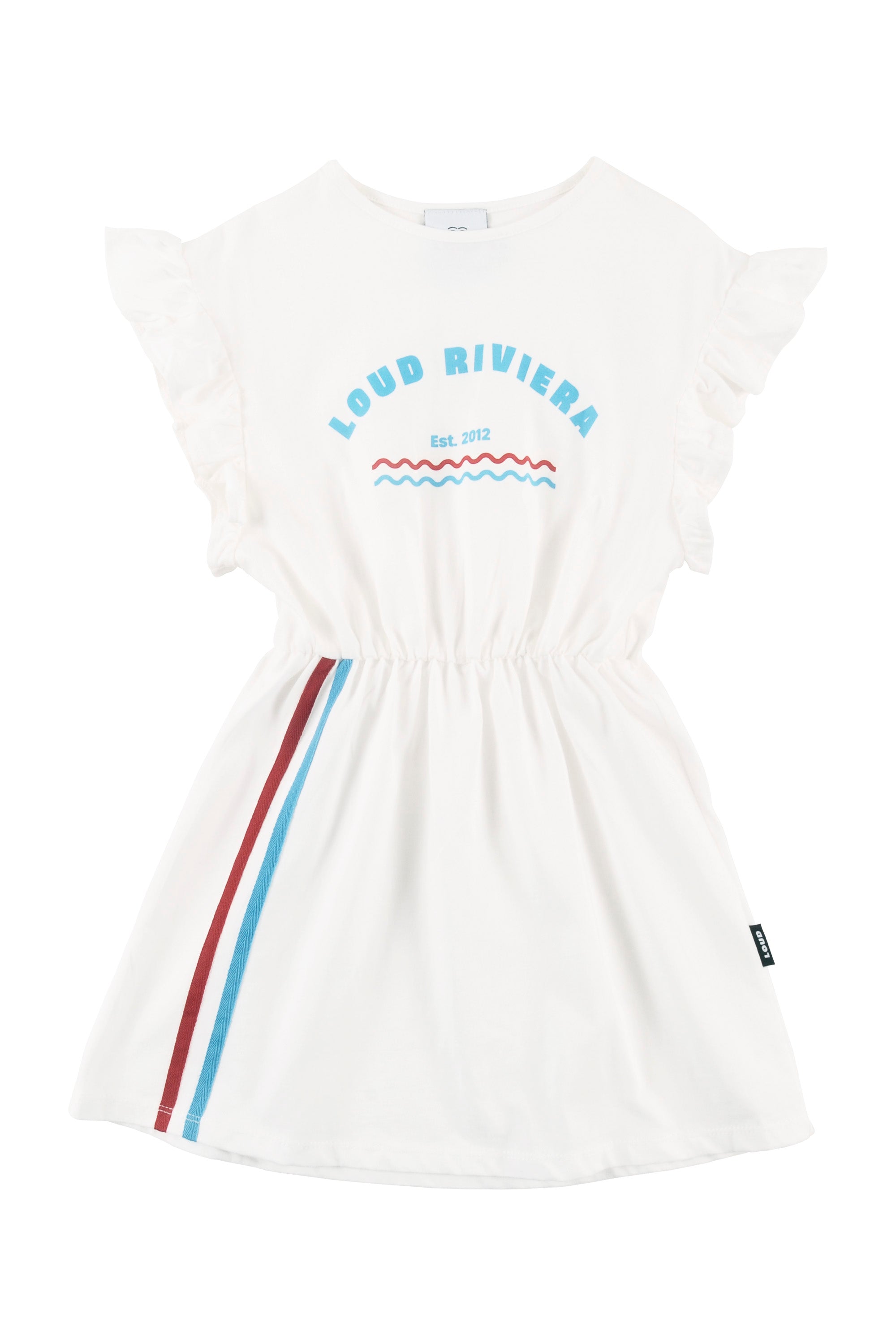 This white dress isn't afraid to make noise. Featuring prominent "Loud Riviera" text that takes center stage, it's paired with spirited red and blue stripes for maximum visual impact. Perfect for anyone who believes fashion should be fun and fearless, this piece brings Mediterranean-inspired energy with a cheeky twist. The clean white base keeps things wearable while the graphic elements ensure you'll never blend into the background. Ideal for summer adventures, casual outings, or whenever you want your outfit to match your personality. Wear it loud, wear it proud.