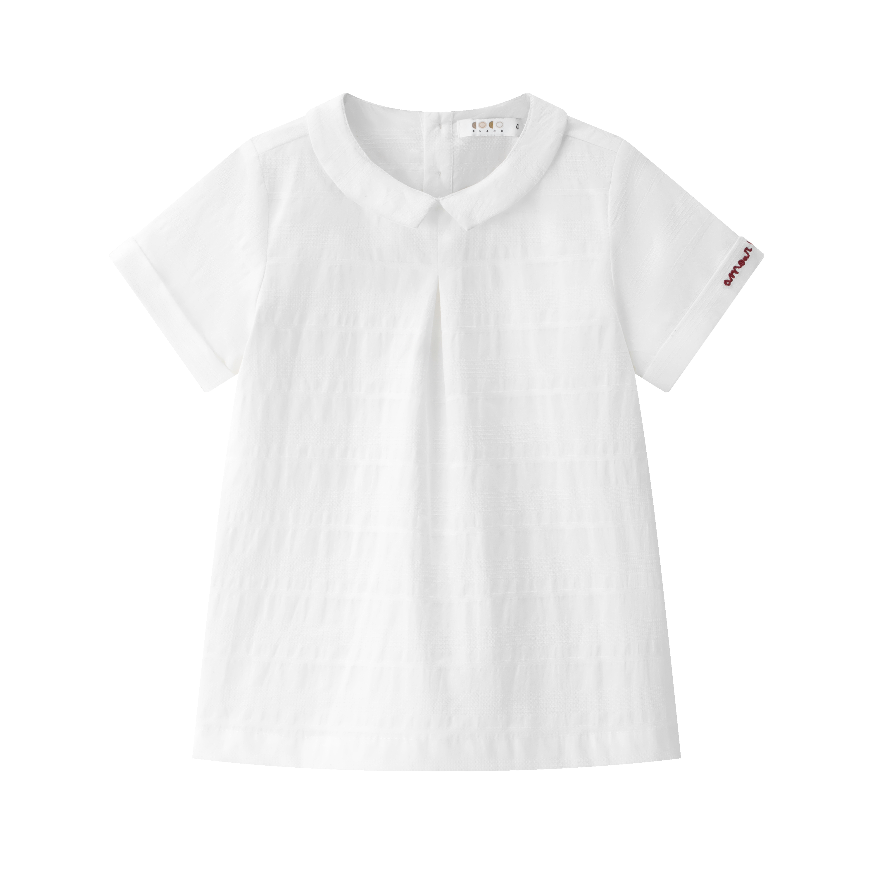 Elevate your wardrobe with this refined white shirt, featuring a timeless Peter Pan collar that adds an understated elegance to any ensemble. The delicate red text detailing on the sleeve introduces a subtle pop of personality while maintaining a polished aesthetic. Perfect for layering or wearing solo, this versatile piece transitions seamlessly from casual to more formal occasions. Crafted with attention to detail, it's a sophisticated staple that complements both classic and contemporary styles.