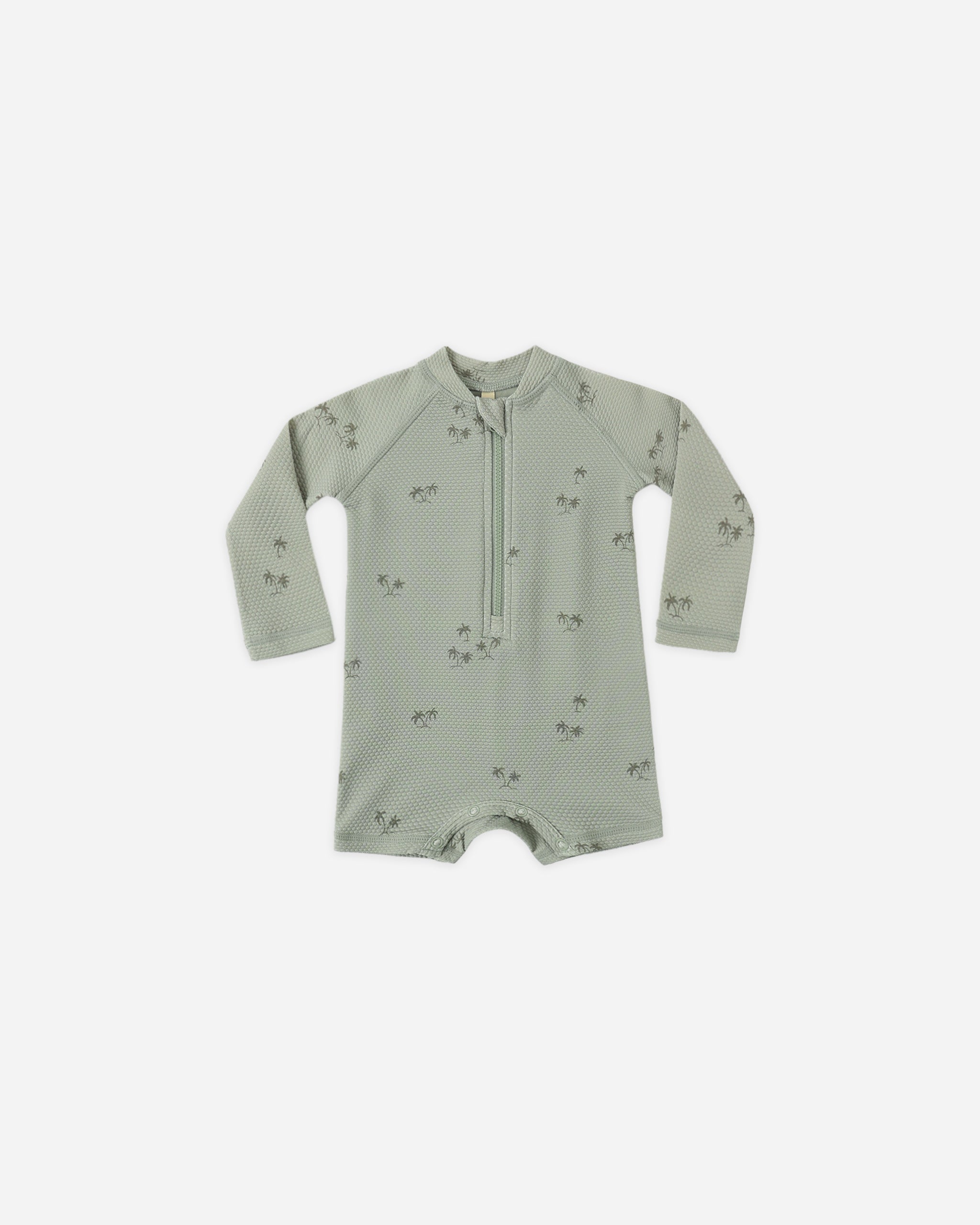 Dive into style with this charming sage green one-piece rashguard featuring playful palm trees scattered across the fabric. Long sleeves provide extra sun protection for all-day water adventures, while the soft, durable design keeps up with active little ones. Perfect for beach days, pool parties, or tropical-themed playtime—comfort meets whimsy in every splash!
