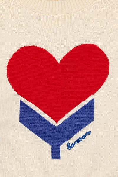 Cozy up in this charming Bonton pullover, featuring a soft ecru knit base that's perfect for layering. The center showcases an adorable red heart flower graphic that adds a sweet pop of personality to your everyday wardrobe. Crafted from quality cotton, this sweater offers comfort and style that works beautifully with jeans, skirts, or your favorite bottoms. A playful piece that brings warmth and whimsy to any outfit.