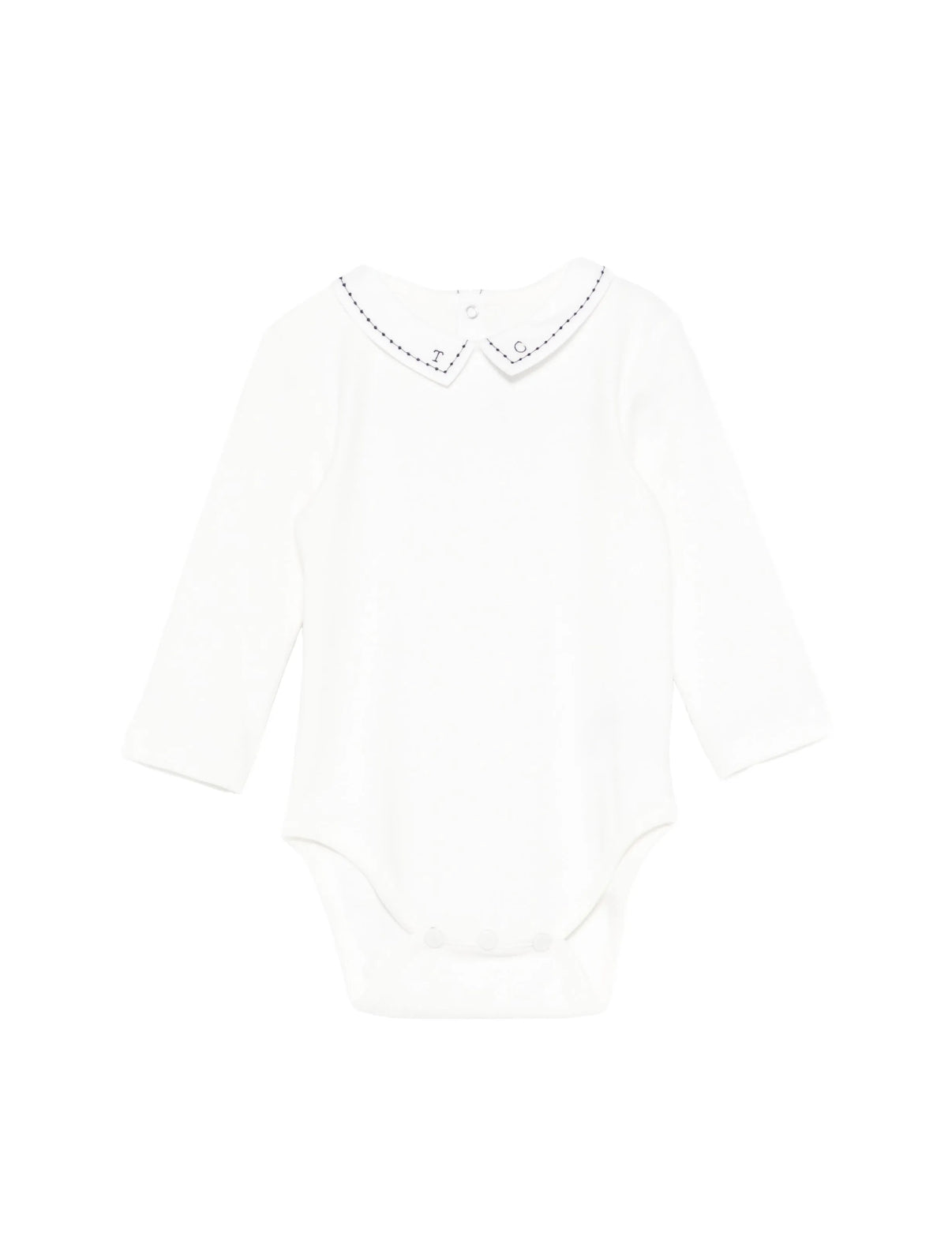 This elegant long-sleeve bodysuit features a classic Peter Pan collar in pristine white, crafted from soft, high-quality fabric for delicate comfort. Its timeless design offers a refined look perfect for special occasions or everyday wear, combining sophistication with gentle ease for your little one.