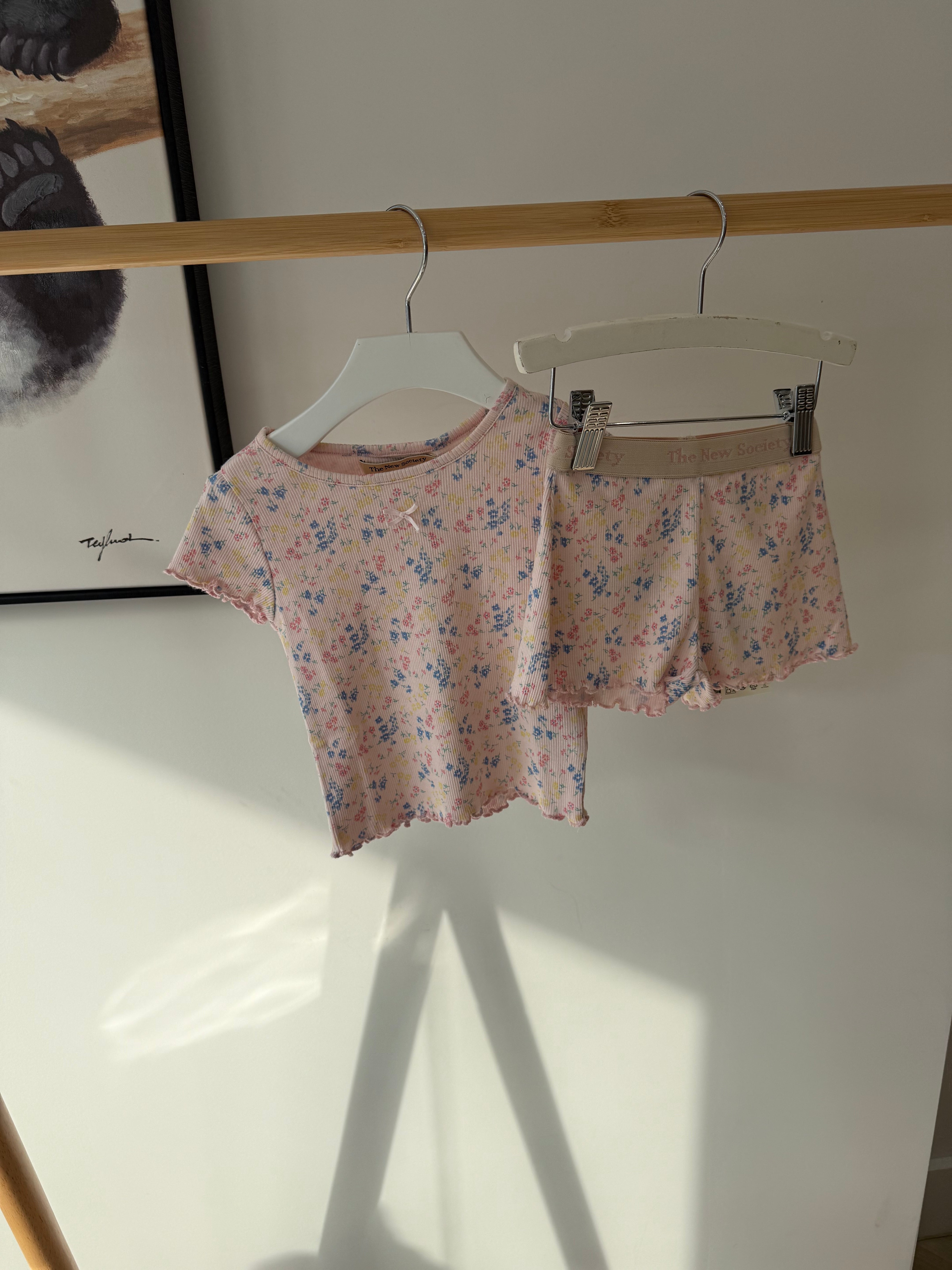 The New Society Sabina Print Tee + Shorts Set features a coordinated floral design that offers a cohesive aesthetic. The combination of breathable fabric in both the tee and shorts promotes comfort and allows for ease of movement, making it suitable for casual outings or relaxed indoor wear.