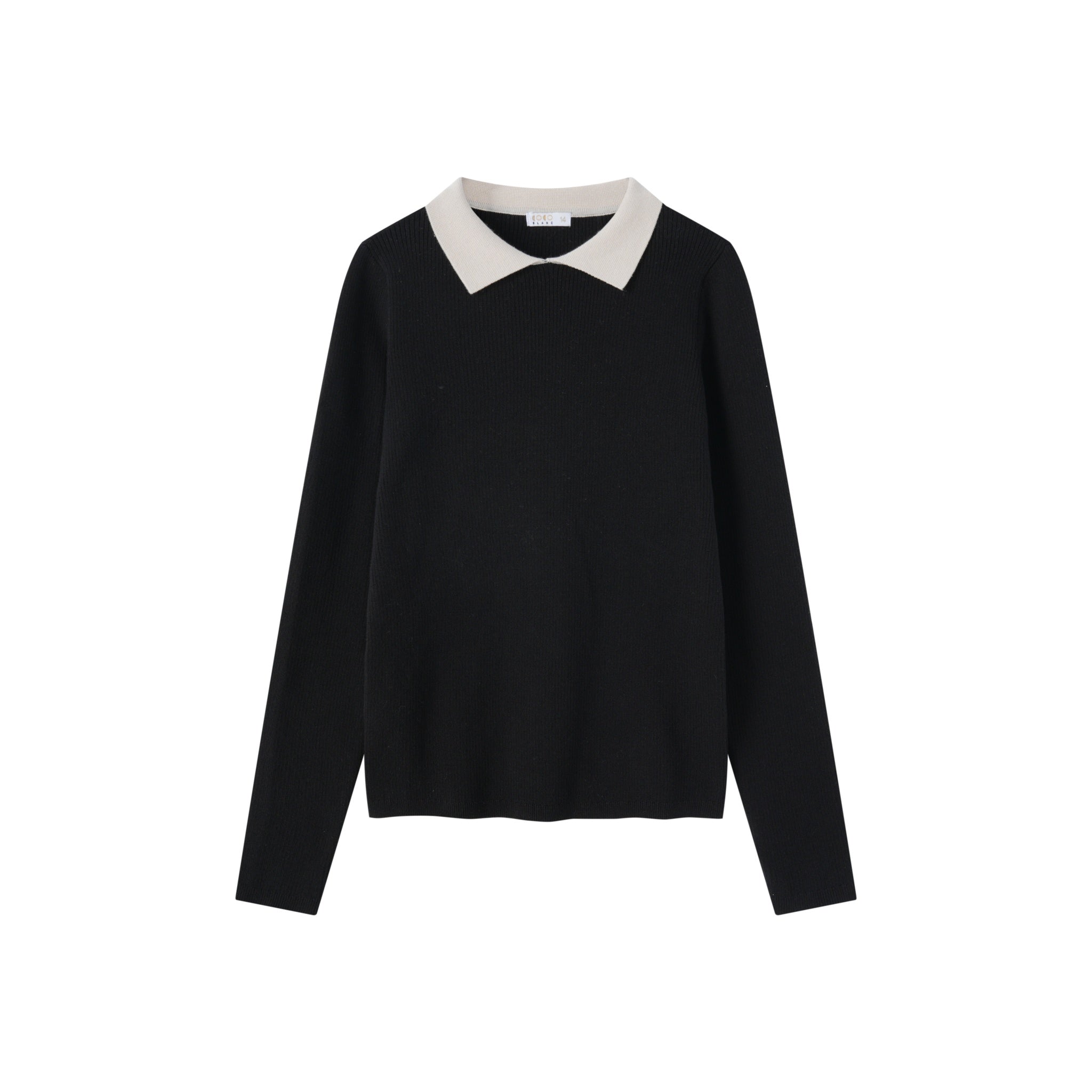 Elevate your everyday wardrobe with this refined sweater, featuring a striking contrast between a deep black body and a luxurious cream collar. The timeless color combination creates an effortlessly polished look, perfect for layering or wearing solo. Crafted with attention to detail, this piece transitions seamlessly from casual afternoons to more refined occasions, offering versatile styling possibilities for the modern wardrobe.